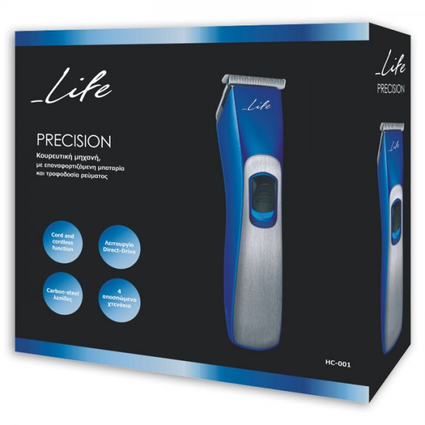 Το τέλειο κούρεμα είναι δουλειά της LIFE Precision. Διαθέτει carbon-steel λεπίδες, για μέγιστη αντοχή, όπως επίσης και T-blade σχήμα λεπίδων για να πετύχετε ένα τέλειο detailing. Λειτουργεί τόσο με ρεύμα, όσο και με την ενσωματωμένη επαναφορτιζόμενη μπαταρία NI-MH, χωρητικότητας 2x600mAh, ενώ αν τελειώσει η μπαταρία μπορείτε να συνεχίσετε αμέσως την δουλειά σας απλά συνδέοντάς την στο ρεύμα. Διαθέτει 4 αποσπώμενα χτενάκια με μήκος κοπής 3, 6, 9, 12mm.