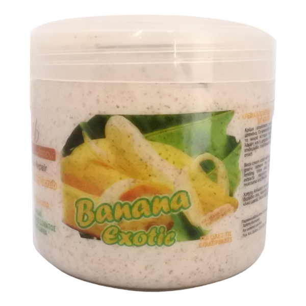 Κρέμα απολέπισης σώματος με Μπανάνα. Οι κόκκοι απομακρύνουν τα νεκρά κύτταρα προσδίδοντας λάμψη ενώ η μπανάνα διατηρεί την επιδερμίδα ενυδατωμένη και ελαστική.