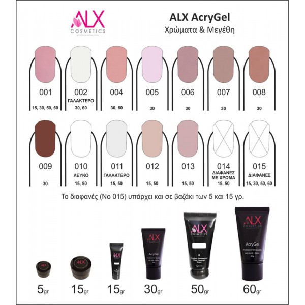 Το ALX Acrygel είναι πηχτό τζελ σε σωληνάριο και χρησιμεύει για φυσική ενίσχυση ή χτίσιμο νυχιού με οποιαδήποτε τεχνική.
