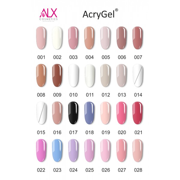 Το ALX Acrygel είναι ένα νέο υλικό εντελώς διαφορετικό από το τζελ ή το ακρυλικό που συνδυάζει τα προταιρήματα του τζελ και του ακρυλικού σε ένα νέο υλικό που δε προκαλεί αλλεργίες. Χρησιμεύει για φυσική ενίσχυση ή χτίσιμο νυχιού, με οποιαδήποτε τεχνική και είναι το μέλλον της ονυχοπλαστικής.