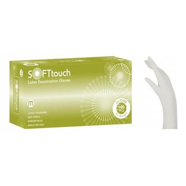 Εξεταστικά γάντια Soft Touch ελαφρώς πουδραρισμένα, μίας χρήσης, αμφιδέξια, από φυσικό latex, σε κρεμώδες λευκό χρώμα και μη αποστειρωμένα.